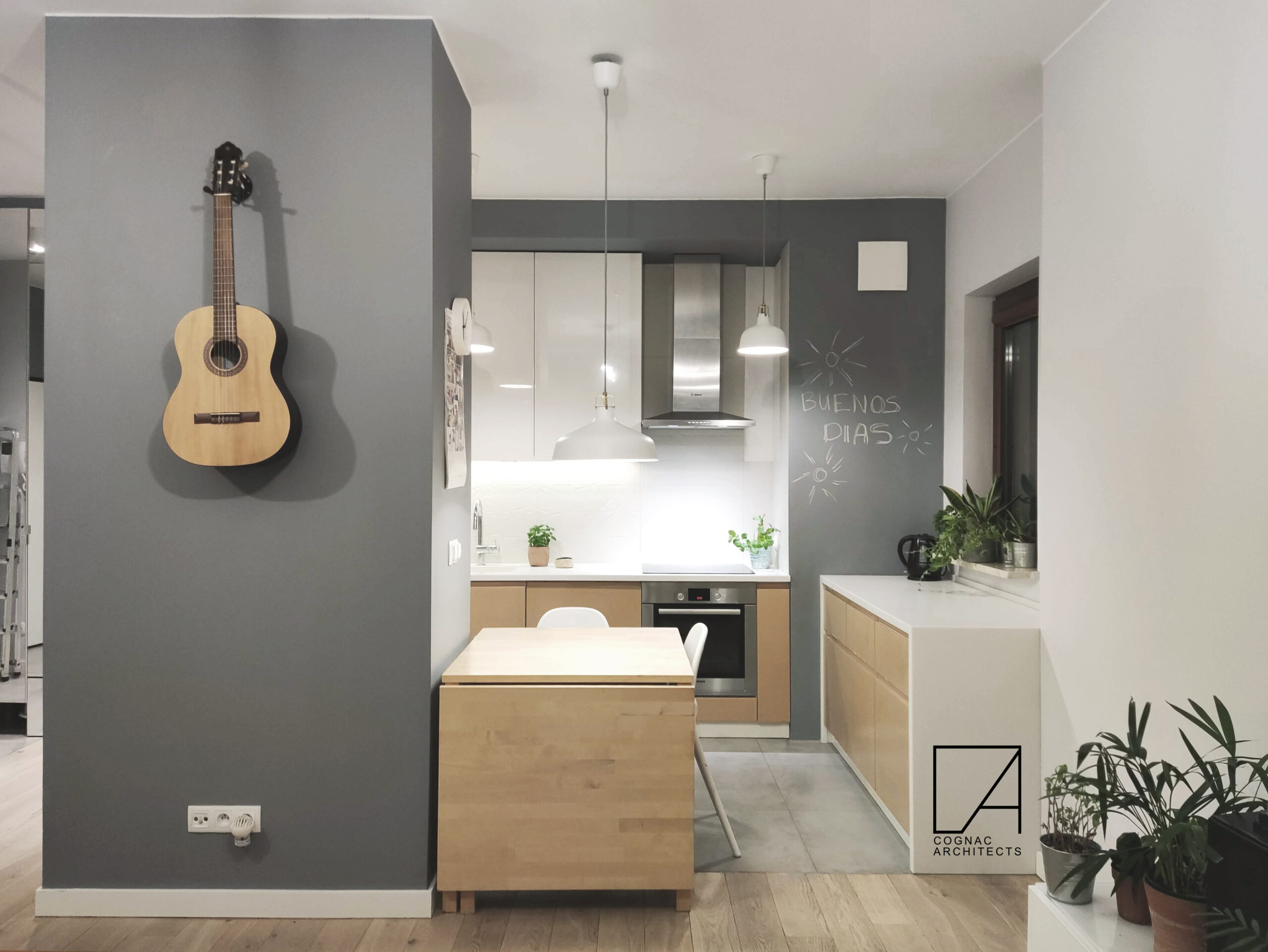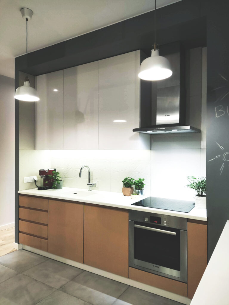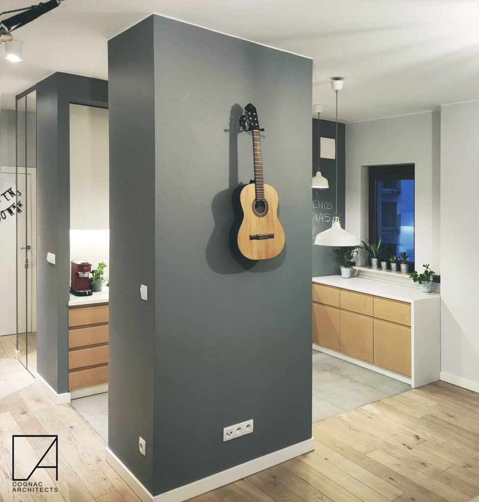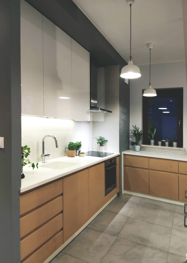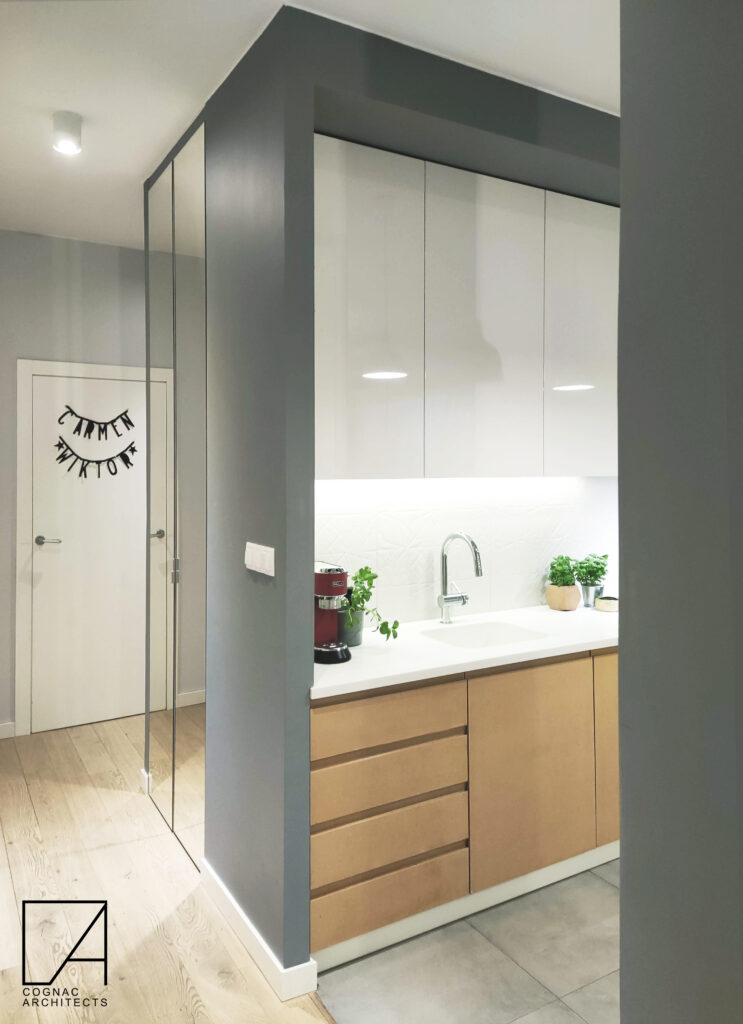 Mieszkanie w Warszawie zostało zaprojektowanie tak, by było jak najmniej mebli. Tak, da się to zrobić. Jest absolutne minimum: kuchnia, kanapa stół z 2 krzesłami, reszta schowana zawsze. Jest szafka pod głośniki i pod kwiatki w salonie. Łóżka i to tyle 🙂 Nawet kocia kuweta jest schowana. Jest na zdjęciach, kto ją dostrzeże? Sesja nie jest profesjonalna, może kiedyś ją uzupełnimy.