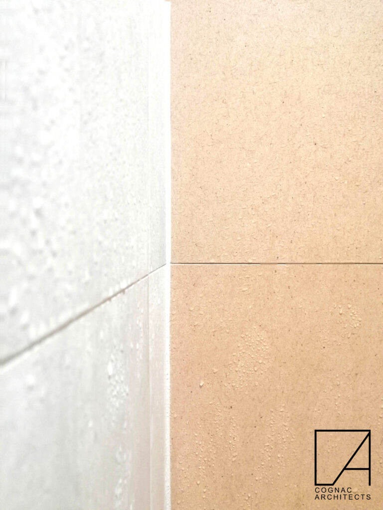 Druga łazienka w fakturowanych, delikatnych w wyrazie płytkach przywodzących na myśl trawertyn, z ogromnym lustrem i z „dywanikiem” na posadzce. Cudowne są te płytki Ornamenta Classic!