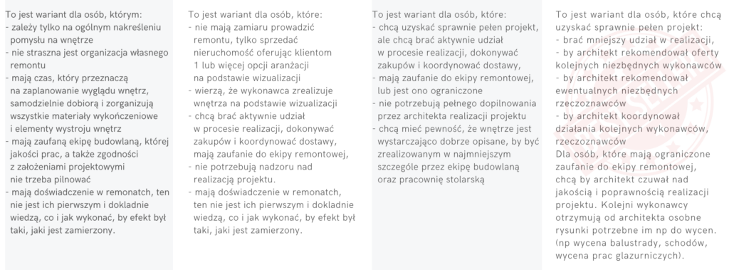 Interesuje Cię koncepcja układu funkcjonalnego, czy pełen projekt wykonawczy? Oferujemy kilka możliwości, dla wygody zebraliśmy je w gotowe pakiety: Wycena jest zawsze przygotowywana indywidualnie. Służymy pomocą w wyborze właściwego zakresu prac projektowych. napisz: kontakt@cognacarchitects.pl Proces projektowy podzielony jest na etapy: